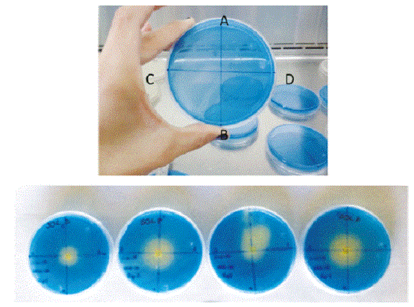 Pruebas de solubilización de fósforo in vitro: del material aislado se utilizaron cepas de 8 hongos, 6 levaduras y 5 bacterias. En el caso de los hongos, las cepas se colocaron en placas petri con el medio propuesto por Osorio y Habte (2001), se consideraron 4 partes iguales separadas imaginariamente por líneas perpendiculares en su centro, de donde se retiró una porción circular de medio, para colocar una porción circular de igual tamaño con el hongo de interés (Figura 3). Para cada hongo se midió, en 4 platos (repeticiones), la formación de halo y el viraje a color amarillo del medio durante una semana, los platos se dejaron en incubación a 25°C y se evaluaron a los 3 y 5 días, momento en que se realizaron las mediciones del radio del halo de solubilización sobre las líneas de los puntos: A-B, C-D de cada plato (Figura 3).
