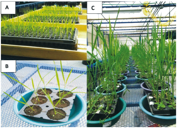 Pruebas en invernadero: todos los ensayos se realizaron en los invernaderos del Centro de Investigaciones Agronómicas durante el transcurso del 2015 y 2016, donde se elaboraron también los almácigos de arroz Palmar 18 en bandejas de 200 celdas, con una mezcla de 75% del suelo Andisol de Rancho Redondo y 25% de peatmoss (Figura 4), con el fin de mejorar el drenaje y la aireación del sustrato. Trece días después de la siembra, las plantas fueron trasplantadas a celdas de 200 cc de capacidad, las cuales se llenaron con el suelo de Rancho Redondo (Figura 4).