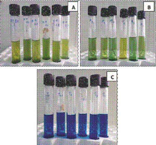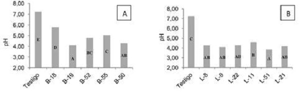 En las pruebas in vitro para las bacterias y levaduras se utilizó el medio líquido de Osorio y Habte (2001), en el cual se observaron los cambios en la coloración, a los 7 días a partir de las inoculaciones (Figura 6). También se determinaron diferencias del pH del medio, causadas por los microorganismos con respecto al testigo, sobre todo en el caso de las levaduras (Figura 7). De manera similar, Cordero et al. (2008) mencionan una disminución del pH del medio de 7,0 a 4,6 en pruebas con Pantoea sp. en medio líquido; los valores de P en solución en el trabajo de Cordero et al. (2008) fue de 1128 µg.ml-1, valores más elevados que los incrementos de 38 y 510 µg.ml-1 P en medio líquido mencionados al utilizar Enterobacter absuriae (Gyaneshwar et al. 1999).