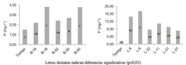 En la presente investigación, el pH del medio disminuyó de 7,2 en el testigo, a 4,1 en el caso de la bacteria B-19 (Figura 7) y en el caso de la levadura L-51, se encontró la mayor reducción del pH con un valor de 3,8 (Figura 7). Los contenidos de P en solución más elevados se observaron con la bacteria B-19 (3,8 mg.l-1 P) en concordancia con los valores de pH más bajos que se obtuvieron. La levadura L-9 presentó una solubilización de P más alta (17,4 mg.l-1 P) que la de las bacterias (Figura 8), sin que se diera una relación tan directa con el pH (Figura 7). Aunque las levaduras in vitro presentan una mayor solubilización de P con respecto a las bacterias, es necesario mencionar que estos microorganismos perdieron rápidamente su habilidad como solubilizadores bajo condiciones de almacenaje en el laboratorio, lo que limita sus posibilidades para ser utilizadas como posibles inoculantes.
