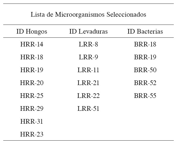 En el caso de las bacterias y levaduras se utilizó el medio de Osorio y Habte (2001) en medio líquido empleando tubos de ensayo con 9,9 ml del medio y a cada tubo se le agregó 100µL del caldo microbiano preparado en solución salina al 0,85% con una turbidez de 108, según el estándar de turbidez McFarland y se realizaron 3 repeticiones por cada bacteria o levadura. Una vez inoculados los tubos se incubaron a 25°C y a 200 rpm, al cabo de una semana los caldos se filtraron utilizando papel filtro Fisherbrand P8, con retención de partículas mayores a los 20 µm. A cada una de las repeticiones se le midió el pH y la cantidad de P en solución, por medio de Espectroscopia de Emisión Óptica de Plasma Acoplado Inductivamente (ICP-OES), los valores se compararon con un testigo, al cual no se le realizó la inoculación de ningún microorganismo. El análisis estadístico se realizó por medio de un ANDEVA y se empleó como separador de medias la prueba de Tukey al 5%. Todas las cepas microbianas se almacenaron en refrigeración y se eligieron los microorganismos H-20 (hongo), L-9 (levadura) y B-19 (bacteria), para ser utilizados en el primer ensayo en invernadero y las cepas de hongos H-20, H-23, H-25 y H-29 para el segundo ensayo.