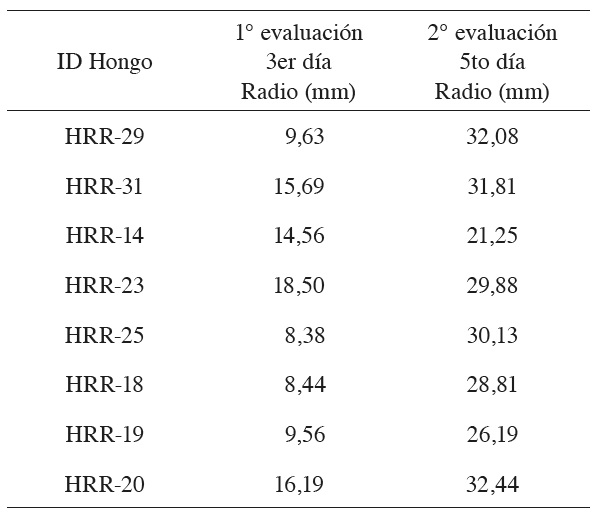 La capacidad de solubilizar P de los hongos se evaluó en medio líquido sin que produjeran cambio de color, ni de pH en el medio de cultivo. Por esta razón, se optó por la evaluación del halo de solubilización en medio sólido y no se encontraran diferencias significativas entre ellos (Cuadro 3, Figura 3), todas mostraron la misma habilidad.