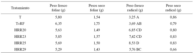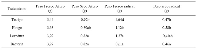 No se encontraron diferencias entre los tratamientos al evaluar el peso fresco foliar (Cuadro 4); en el caso del peso seco aéreo, el tratamiento testigo mostró el mayor valor con 0,92 g, el cual es estadísticamente igual al tratamiento con adición del hongo (0,89 g) y mayor a los tratamientos con levadura y bacteria, los cuales obtuvieron 0,82 g. El peso fresco radical fue mayor para el testigo (1,64 g), mientras que el peso seco radical fue estadísticamente menor para el tratamiento con la aplicación de levadura (0,41 g) e igual para el testigo (0,64 g) y el tratamiento con adición del hongo (0,58 g) y la bacteria (0,46 g) (Cuadro 4). Como se detalla a continuación en otras investigaciones se ha encontrado un mayor crecimiento de las plantas inoculadas con microorganismos solubilizadores de P en comparación a las no inoculadas; López et al. (2008) mencionan aumentos en la altura de planta, largo y ancho de hoja de las plantas de maíz (Zea mays) inoculadas con Bacillus megatherium var. Phosphaticum (solubilizador de P) y Azotobacter sp. (fijador de N) en comparación al testigo, y Echeverría (2012) un aumento en el crecimiento aéreo y radical, una mayor absorción de P y N en plantas de tomate de árbol (Solanum betaceum) inoculadas con Pseudomonas fluorescens.