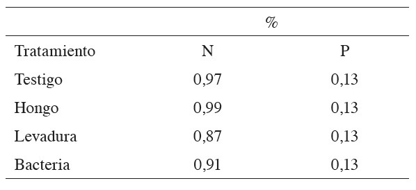 Debido a lo anterior, se podría deducir que el suelo utilizado tiene un alto potencial de adsorber P, ya que solo presentó un contenido de P total de 900 mg.l-1 (Cuadro 1), por lo que cuenta con una alta capacidad de adsorción. Este hecho afectó la eficiencia de los microorganismos evaluados, lo que los hace poco efectivos en hacer disponible este elemento para las plantas, por lo que se presenta más bien una inmovilización microbiana (Richardson 2009), de esta manera, los tratamientos en los cuales se realizaron inoculaciones, no afectaron las concentraciones foliares de este elemento (Cuadro 5).