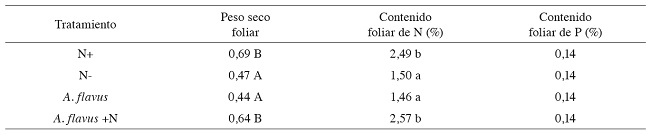 Se realizó un ensayo preliminar a este, para evaluar el posible efecto de la fertilización nitrogenada (100 kg.ha-1 a razón de 200 plantas m2), sobre la absorción de P. Se evaluaron 4 tratamientos, con 4 repeticiones: control con N, control sin N, inoculación de A. flavus e inoculación de A. flavus más fertilización nitrogenada.