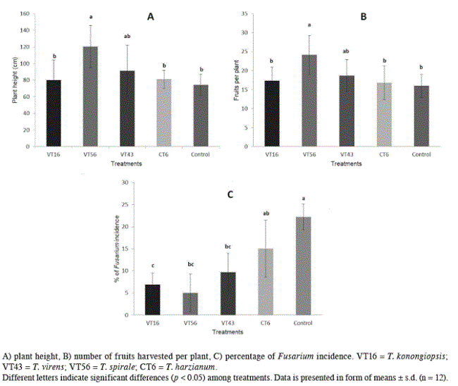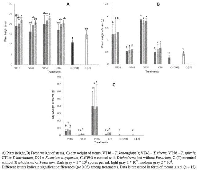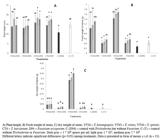 Measured variables such as plant height were significantly different when compared with positive control (plants infected with F. oxysporum) (p≤0.001; α=0.05). Plants inoculated with Trichoderma species and F. oxysporum kept the same