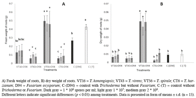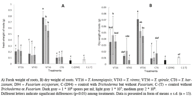 Fresh weight of plant roots showed significant differences between treatments (p≤0.001; α=0.05). Trichoderma spirale, and control plants (without F. oxysporum or Trichoderma sp.) were heavier (0.5±0.06 and 0.43±0.03 respectively) (Figure 2A) compared to all other treatments. When the roots’ dry weight was calculated, plants infected with F. oxysporum and inoculated with T. spirale showed differences comparing with other treatments (p≤0.001; α=0.05) (Figure 2B).