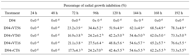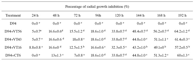Antifungal index (%) = [1-(Da-0.5)/(Db-0.5)] x 100 The experiment had 5 replicas and was repeated three times.