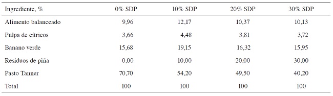 Las dietas contenían una mezcla de alimento balanceado comercial, citropulpa deshidratada, banano verde fresco picado, pasto de corte Tanner (Brachiaria radicans), minerales y la cantidad correspondiente de SDP (Cuadro 1). La mezcla se suministró en 2 porciones diarias (8:00 a.m y 4:00 p.m). Los SDP utilizados consistieron principalmente de la cáscara del fruto y porciones variables de pulpa. Los animales tuvieron libre acceso a agua limpia y fresca durante el tiempo del experimento.