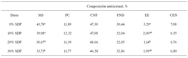 La cantidad de nutrientes consumidos en cada uno de los tratamientos se presenta en el Cuadro 4. Se encontraron diferencias significativas (p<0,05) para el consumo PC, CNF, FND, EE y CEN para los diferentes grupos. El grupo de animales, en la dieta control (0% SDP), consumió la mayor cantidad de nutrientes (p<0,05), situación que se le atribuye al mayor consumo de MS que presentaron los animales en dicho tratamiento.