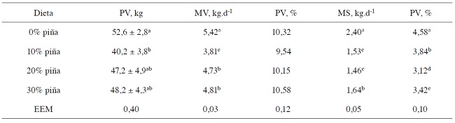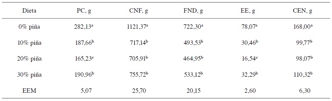 La composición nutricional de las dietas utilizadas en el estudio se presenta en el Cuadro 2. La dieta control presentó la mayor concentración de materia seca (43,78%) y se observó que el contenido de materia seca disminuyó significativamente (p<0,05), conforme incrementó la inclusión de subproductos de piña, lo cual es de esperar, debido al alto contenido de humedad (>89%) en estos productos (López et al. 2009).