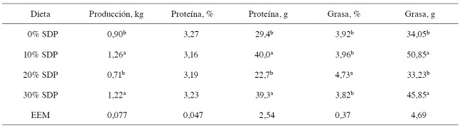 No se encontraron diferencias significativas (p>0,05) para la concentración de proteína en la leche para los diferentes tratamientos; sin embargo, el porcentaje de grasa en la leche de las cabras alimentadas con 20 de SDP mostró un incremento (p<0,05), en comparación con los animales que consumieron la otras dietas. Los animales que consumieron las dietas con una inclusión de 10 y 30% de SDP mostraron mayor producción de proteína y grasa (p<0,05).