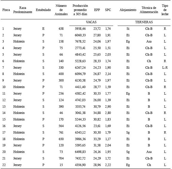 Como caso particular, en la Finca 20, las terneras se alojan de forma grupal los primeros 60 días de vida. La finca mantiene una política de reemplazos abierta, en la cual se crían anima- les dentro del hato, aunque también se adquieren hembras fuera de la finca; tampoco hay análisis de la leche entera que se utiliza como fuente de alimentación de las terneras lactantes. Estas características se podrían considerar como posi- bles factores de riesgo a incrementar la EPP.