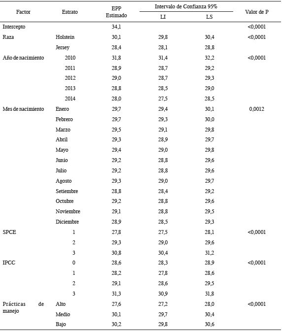 El modelo evaluado convergió satisfacto- riamente (p<0,001) con un cumplimiento adecua- do de los supuestos de normalidad, independencia y varianza constante de los residuos. Asimismo, se presentó un efecto significativo de la mayoría de las variables de animal y ambiente sobre la EPP (Cuadro 2).