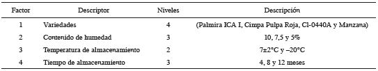 Para determinar la tolerancia al alma- cenamiento se realizó un ensayo factorial. Se guardaron semillas que contenían 10; 7,5 y 5% de contenido de humedad, a 7±2C y -20C de los 4 materiales durante 12 meses. Se realizaron mediciones periódicas de la viabilidad, germi- nación y vigor cada 4 meses. Los contenidos de humedad se obtuvieron mediante la exposición de las semillas en un cuarto de secado (T: 20oC y HR: 10%) durante 4 días. Los factores evaluados en la tolerancia al almacenamiento se ilustran en la Cuadro 1.
