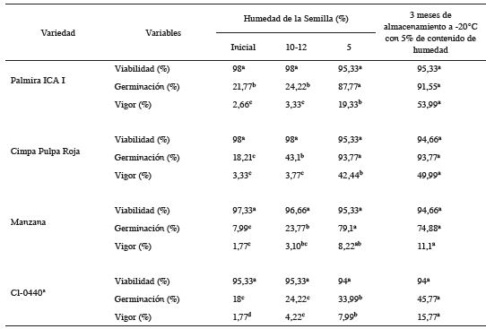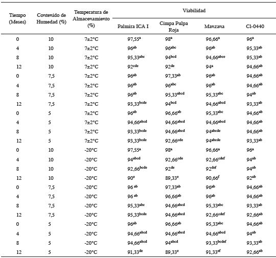 La semilla de la variedad Palmira ICA I almacenada con un contenido de humedad del 10%, a 7±2°C y -20°C de conservación presentó una disminución significativa en la viabilidad a los 12 meses de almacenamiento (Cuadro 3), mientras que las semillas conservadas con un contenido de humedad del 7,5% en estas con- diciones de temperatura, fueron viables en el tiempo. La semilla almacenada con un contenido de humedad del 5% presentó una disminución significativa en la viabilidad durante los 12 meses de conservación cuando la semilla se almacenó a -20°C.