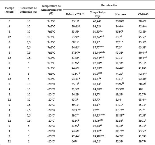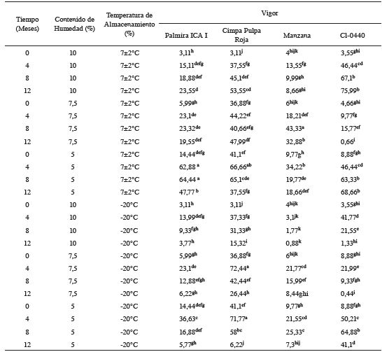 La semilla de la variedad Palmira ICA I con un contenido de humedad del 10 y 5% a 7±2°C presentó un aumento significativo en la germinación a los 4 meses de conservación y la semilla con un contenido de humedad del 7,5% en las 2 condiciones de temperatura mostró una dis- minución significativa en la germinación durante los 12 meses. La semilla de esta misma variedad con un contenido de humedad del 5% a -20°C, durante 12 meses de conservación, exhibió un aumento significativo en la germinación a partir de los 4 meses y se mantuvo hasta los 8 meses de conservación con una disminución significativa a los 12 meses de almacenamiento (Cuadro 4).