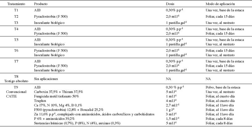 Una vez en el área de propagación, se pre- pararon las estaquillas de 5-7 cm de longitud, se cortaron justo arriba del tercer nudo y podaron las 4 hojas de cada estaquilla para dejar 2,5-3 cm2 de cada hoja. Las estaquillas preparadas se iban depositando en otro recipiente con agua y, de ahí, se tomaron para hacer la aplicación de los dife- rentes tratamientos con auxinas y los productos a evaluar. Se evaluaron 9 tratamientos, detallados en el Cuadro 1.