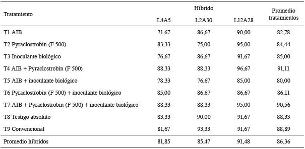 La aparición de raíces a través de los pellets, se inició en la semana 6, y al término de 11 semanas, todas las estaquillas vivas habían emitido raíces, con lo cual se dio por finalizada la fase de enraizamiento. No hubo diferencias entre tratamientos ni entre híbridos para por- centaje de enraizamiento, con valores superiores a 71% en todos los casos y un promedio global de 86,36% (Cuadro 2). Los altos valores obte- nidos demuestran que, con cuidados y técnicas adecuadas, los híbridos pueden ser fácilmente propagados mediante la técnica de enraizamiento de estaquillas.
