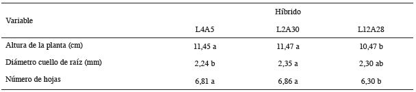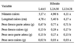 Con respecto a los híbridos, se encontraron diferencias significativas para todas las variables evaluadas en el muestreo destructivo (Cuadro 3), generalmente debidas a la superioridad de los híbridos L2A30 y L12A28. Estos híbridos fueron los más precoces para enraizar, muy posiblemen- te, debido a sus características genéticas, lo cual se vio reflejado posteriormente en mayores valo- res en estas variables de crecimiento.