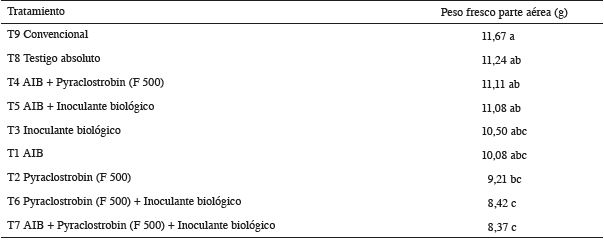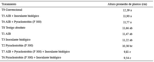 Se notó también el efecto positivo sobre el crecimiento de las plantas en los tratamien- tos que incluyeron Pyraclostrobin (F 500) o el inoculante biológico junto al AIB, pero no así cuando los 2 primeros productos se aplicaron de manera conjunta. Esto sugiere la importancia de utilizar en la fase de enraizamiento productos con efectos complementarios, auxínicos (AIB) junto a estimulantes de raíz (inoculante biológico) o de la fotosíntesis (Pyraclostrobin (F 500), lo cual logra así un mejor desempeño que cuando se aplicó cada producto por separado. El hecho de que hubo un menor desarrollo de las plantas cuando se aplicaron los 3 productos juntos, o bien cuan- do se aplicó únicamente Pyraclostrobin (F 500) junto al inoculante biológico, sugiere, quizás, un efecto de toxicidad por exceso de aplicaciones y/o alguna sinergia negativa. Sin embargo, se requie- ren estudios más detallados para confirmar o descartar este efecto y sus posibles causas, lo cual no estuvo dentro de los alcances de este trabajo.