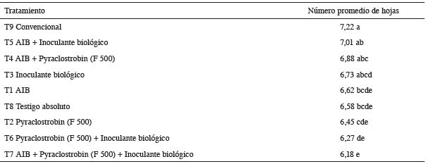 Si bien durante la fase de enraizamiento no se encontraron diferencias significativas entre tratamientos, sí se notó su efecto posteriormente en el desarrollo de las plantas a nivel de vivero. Se encontraron diferencias significativas entre tratamientos para las variables altura de plantas (Cuadro 4), número de hojas (Cuadro 5) y peso fresco de la parte aérea (Cuadro 6). En general destacó el desempeño superior del tratamiento convencional de uso actual por parte del progra- ma de propagación del CATIE. Esto confirma que las investigaciones que se han llevado a cabo desde el inicio del programa han sido efectivas en seleccionar los productos óptimos para garantizar el enraizamiento efectivo de las estaquillas, que se tradujo luego en un buen desempeño en vivero (Mesén y Jiménez 2016). Este tratamiento inclu- ye tanto AIB, como otros productos promotores del enraizamiento, además, de un complemento nutricional (Cuadro 1), todo lo cual contribuyó al buen desarrollo de las plantas en vivero.
