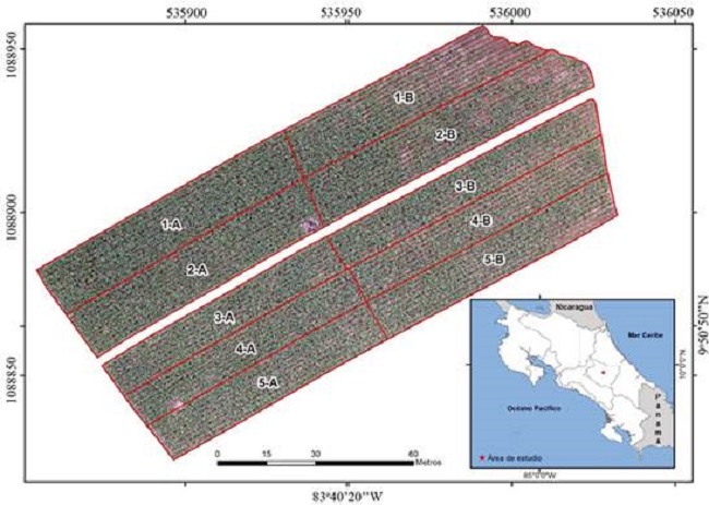 La investigación se llevó a cabo en un lote de la cooperativa CoopeCañita R.L, ubicado en el cantón de Turrialba, Costa Rica entre las coordenadas 9,847107° - 9,847802° latitud Norte y 83,672923° - 83,671532° longitud Oeste. El lote tenía una extensión aproximada de una hectárea y fue subdividido en 10 sublotes, en cada uno de los cuales se hizo la evaluación de las variables de rendimiento de campo a nivel comercial de caña de azúcar. Esta subdivisión se realizó para facilitar el tratamiento de la información y para obtener más fuentes de variación de crecimiento del cultivo y sus correspondientes variables de rendimiento, así como, el disminuir la variabilidad espacial que pudiese afectar el análisis final de los datos (Figura 1).