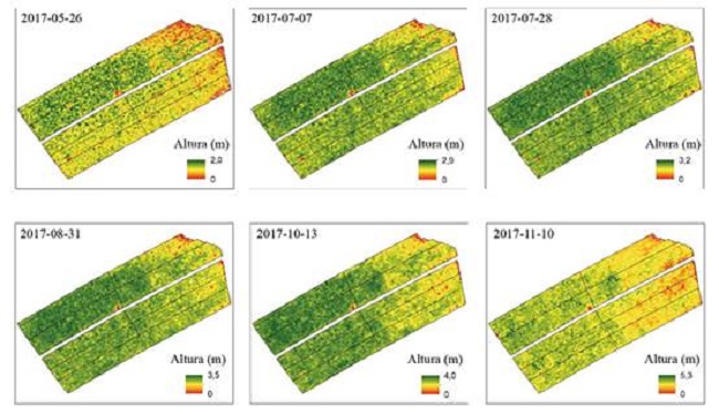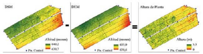 Estas herramientas además permiten dar seguimiento y monitoreo a los cultivos en los diferentes estados fenológicos mediante estimados de las características biométricas de las plantaciones (García y Herrera 2015). Por ejemplo, con la utilización de los DSM y los DEM, generados con diferentes cámaras instaladas en un VANT, es posible calcular la altura de los cultivos, lo que genera un insumo de mucha utilidad para el mejoramiento y la gestión de los factores bióticos y abióticos que influyen desarrollo de los cultivos (Lillesand y Kiefer 1987, García y Herrera 2015). Luego, a partir de estas estimaciones biométricas, es posible realizar estimaciones de productividad, que permitan definir estrategias de manejo de acuerdo con el comportamiento espacial y temporal del cultivo (Furukawa et al. 2020).