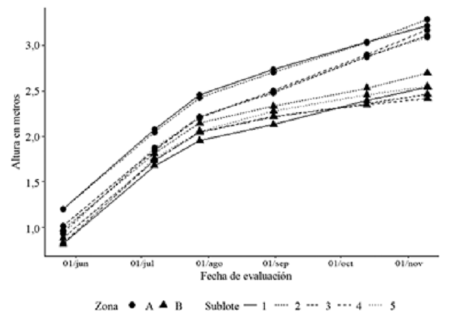 Estas diferencias se hicieron más notorias en la última evaluación; los sublotes de la zona A presentaron un promedio de altura de 3,2 m, en tanto los sublotes de la zona B con un menor crecimiento presentaron una altura promedio de 2,5 m (Figura 3).