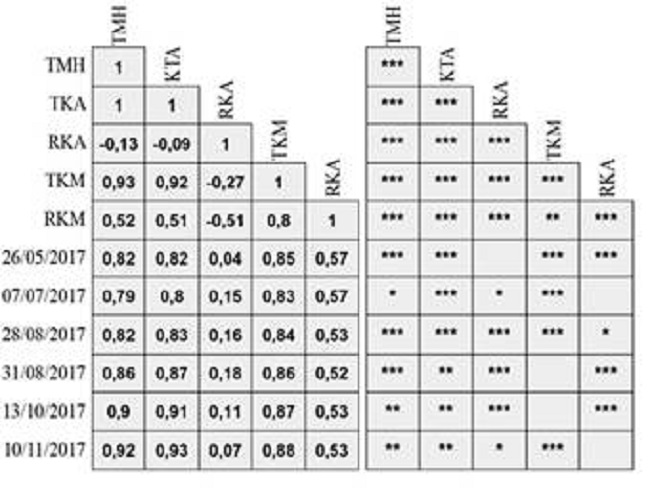 Se encontró que la mayor correlación fue realizada en la determinación del 10/11/2017, en la cual las variables de rendimiento TMH, TKA y TKM, presentaron las mejores correlaciones (valor de “R”) con respecto al promedio de altura (0,91, 0,92 y 0,88, respectivamente). La correlación de 0,91, entre la altura de plantas y el rendimiento en TMH, fue superior a la encontrada por Mutanga et al. (2013) al correlacionar las mismas variables (“R” de 0,58).