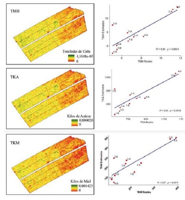 Los gráficos de la derecha presentan la correlación de Pearson entre la variable evaluada en campo y la variable estimada a partir de la sumatoria de todos los pixeles que conforma cada sublote.