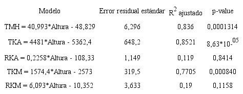 Como se puede observar, los modelos lineales confirmaron que las variables RKA y RKM presentaron bajas correlaciones con el promedio de la altura (y por ende, por la colinealidad mencionada anteriormente, con el volumen estimado). Por el contrario, las variables con mejores coeficientes de determinación ajustados fueron TMH y TKA con un 84% y un 85%, respectivamente, y en menor grado TKM con un 77%.