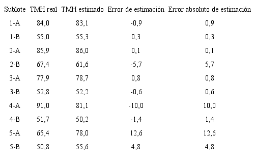 La ejecución del modelo de estimación TMH permitió determinar que los sublotes 1-A, 1-B, 2-A, 3-A y 3-B presentaron los menores errores absolutos de estimación, con errores de estimación inferiores a 1 ton.ha-1 (Tabla 2). El sublote con mayor error absoluto de estimación fue 5-A con un error de 12,6 ton.ha-1 (Tabla 2). El promedio general de error absoluto fue 3,7 ton.ha-1. La información de la Tabla 2 permitió validar la correcta ejecución del modelo TMH.