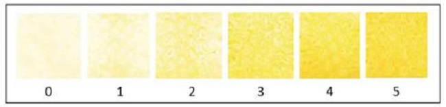 En la cara superior de la fruta (cara expuesta en el empaque comercial) se midió el color externo al inicio y al final del período de almacenamiento con la escala de color comercial, los datos obtenidos se expresaron como porcentaje de cambio con respecto al color inicial. Se determinó, además, la incidencia y severidad de la deshidratación parcial de los frutículos (DPA). Se evaluaron 10 frutículos por fruta, donde se identificaron los afectados con hundimientos en los bordes (incidencia) y cuántos de estos mostraban afectación en más de un 25% de su superficie (severidad). Al inicio y final de almacenamiento, se determinó el porcentaje de cambio relativo de color interno de la fruta, a través de la escala visual utilizada comercialmente (Figura 1). La traslucidez de la pulpa se midió como un porcentaje de la longitud de la fruta medida desde la base hasta la inserción de la corona en la fruta que mostró síntomas de translucidez tejidos con líquido en espacios intercelulares que presenta apariencia cristalina o translucida.