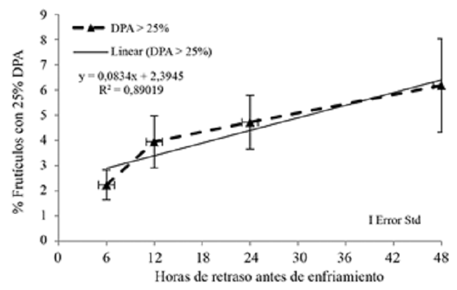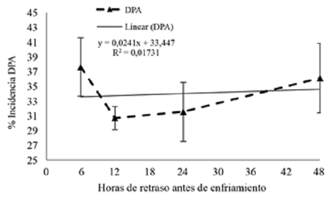 Para este grupo de ensayos, la incidencia de DPA estuvo poco asociado con el período de espera antes de enfriamiento (Figura 9), aunque la presencia de frutículos con más de un 25% del área afectada por DPA, sí fue influenciada por los tiempos de espera (Figura 10),