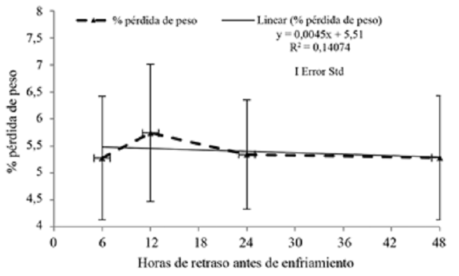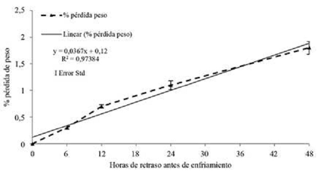 La pérdida de peso de las frutas se incrementó conforme los lapsos de espera, entre cosecha e inicio de enfriamiento, fueron más amplios. Los frutos, que experimentaron 24 y 48 horas de espera, perdieron peso por arriba del 1%. Los tiempos más largos de espera implican que la tasa respiratoria del fruto estuvo en niveles más altos y, consecuentemente, se produjo mayor consumo de carbohidratos y liberación de agua. Se identificó además, que las temperaturas altas en las zonas donde se llevaron a cabo los ensayos, expusieron más pérdida de humedad por transpiración directa. Es así como se evidencia que el tiempo de espera debería ser ajustado, ya sea que se amplíe o reduzca de acuerdo con la temperatura ambiente; además deberán contabilizarse los grados-hora acumulados durante la espera.