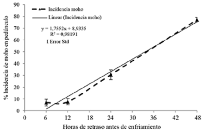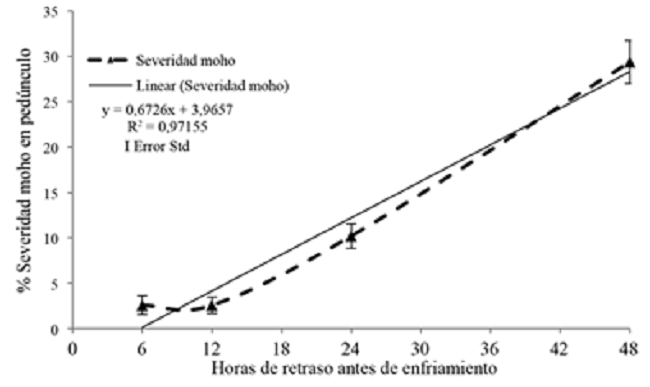Para el desarrollo de moho en el corte, se determinó que la incidencia (Figura 4) y la severidad, del promedio de los 4 ensayos (Figura 5), fueron afectadas por el tiempo de espera. El ajuste observado para estas variables es lineal creciente con un R2=0,9818 y R2=0,9715, respectivamente, por lo que conforme aumentó el período de espera entre cosecha e inicio de enfriamiento y se presentó un aumento en el desarrollo de la enfermedad, tanto en incidencia como en severidad.