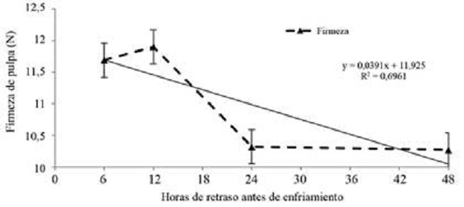 La firmeza de la pulpa (Figura 6), expresada en Newtons, decreció conforme aumentó el tiempo de espera previo al enfriamiento, con un R2=0,6961. Esta disminución fue significativa entre los tiempos de espera, donde los mayores valores se observaron con los tratamientos de 6 y 12 horas ,y una disminución de firmeza para los tratamientos de 24 y 48 horas.