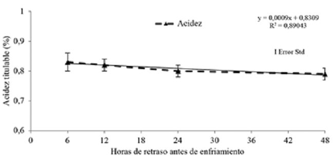 La acidez titulable (Figura 7) mostró un comportamiento estable y no se detectaron diferencias significativas entre tiempos de retraso el comportamiento general es el de una línea recta decreciente, pero con muy baja pendiente o disminución relativa (R2=0,8904).