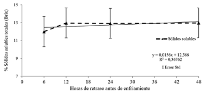 No se observaron (Figura 8) diferencias significativas entre tratamientos para el contenido de sólidos solubles totales (Brix) con una probabilidad de 0,4605. El contenido de sólidos solubles no varió por efecto de los tiempos de espera o retraso antes de enfriamiento.