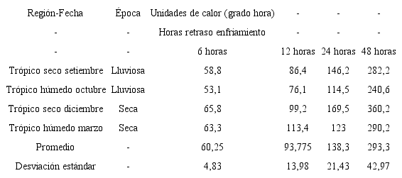 En Tabla 1, se muestran las unidades de calor acumuladas luego de cada período de espera antes de enfriamiento para cada uno de los ensayos realizados; la menor cantidad de energía acumulada se obtuvo para el ensayo en la región de trópico húmedo ejecutado en octubre, que correspondió a una época de muy alta precipitación y nubosidad, mientras que los mayores valores de energía acumulada, se obtuvieron para el ensayo realizado en el trópico seco durante diciembre, que correspondió a la época seca de la zona, con altas temperaturas y alto brillo solar. El cálculo se realizó con la suma de unidades de calor acumuladas por arriba de una temperatura de 18°C.