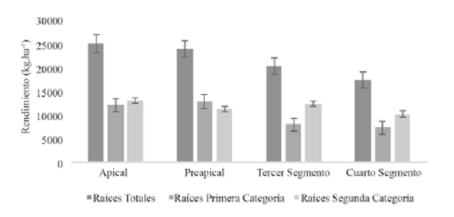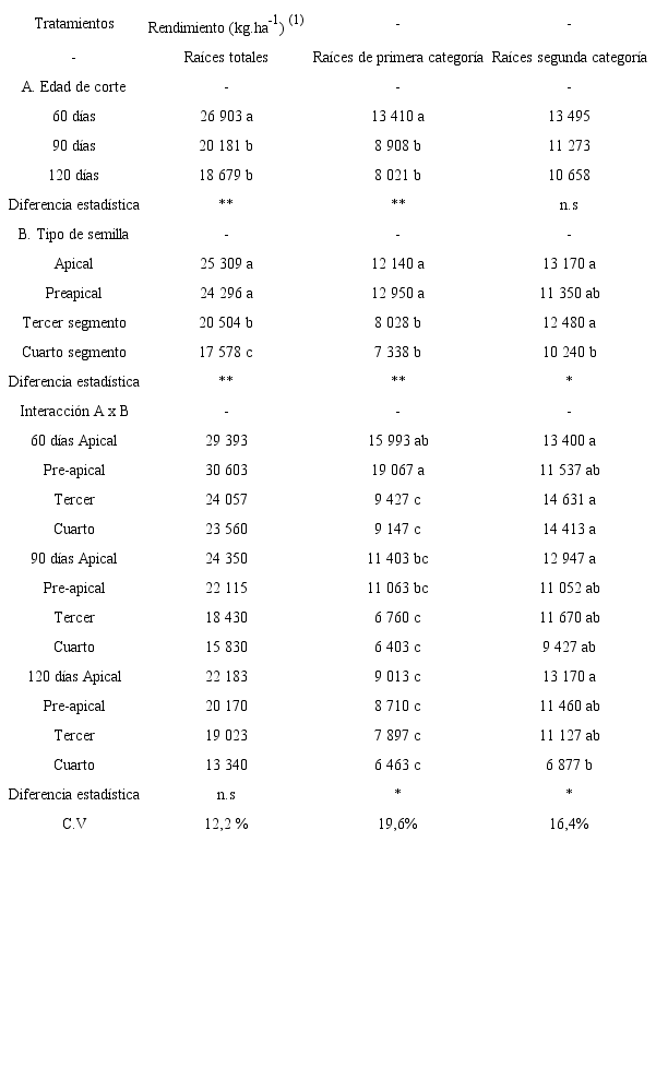 Con referencia a esta variable, en la Tabla 2, se observa que hubo diferencia estadística en casi todos los tratamientos, a excepción, de los tratamientos edad de siembra con evaluación de raíces de segunda categoría y en la interacción (AxB) de la evolución de raíces totales. Al cortar la semilla asexual a los 60 DDS, se lograron los mayores valores de producción de raíces totales y raíces de primera categoría (26,9 t.ha-1 y 13,4 t.ha-1, respectivamente).
