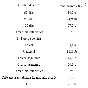 Se observó diferencia estadística significativa para las variables edad de corte y tipo de semilla, mientras que en la interacción no se presentó diferencias estadísticas (Tabla 1).