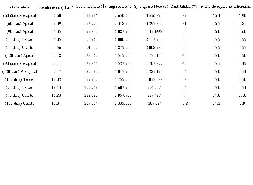 En relación con los indicadores de retorno económico, de acuerdo con la Tabla 4, los tratamientos con menores costos unitarios de producción fueron los de 60 días Pre-apical ($133.795 t-1) y apical ($137.971 t-1), así como los mayores ingresos netos ($3.556.870 y $3.292.865, respectivamente). Lo que incurrió en mayores costos unitarios fue la semilla de 120 días del cuarto segmento ($265.374 t-1). En relación con la rentabilidad, también se presentan en la tendencia anterior, los tratamientos de 60 días Pre-apical (87%) y 60 días apical (81%) que expusieron las mayores rentabilidades, comparados con el de 120 días de cuarto segmento con rentabilidad negativa (-5,8%). Esos resultados coinciden con los obtenidos por Díaz et al. (2013), quienes señalaron que la nueva tecnología propuesta resultó desde la perspectiva económica más factible que se utiliza en lo común.