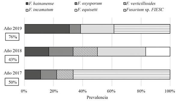 Las especies más abundantes deFusariumen el 2017 y 2019 incluyeron las pertenecientes al complejo de especiesFusarium incarnatum-equiseti(FIESC), mientras que en el 2018 la mayoría de las muestras estaban contaminadas conF. incarnatum(Figura 2). Por otro lado,F. equisetti, solo estuvo presente en una muestra del 2018 yF. oxysporumestuvo presente en los 3 años evaluados, mientras queF. verticillioidessolo en muestras del 2017 y 2018 (Figura 2).