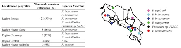 La mayoría de las muestras fueron recolectadas en Pérez Zeledón, San José (Región Brunca) (Tabla 3), de las cuales se aisló el 71% de las especies deFusarium. De los frijoles de esta Región se recuperaron 4 de las 6 especies identificadas deFusariumen granos de frijol negro:F. hainanense,F. incarnatum,F. oxysporumyF. verticillioides, además, se aislaron especies que no pudieron ser identificadas pertenecientes al complejo de especies FIESC (Fusarium sp.FIESC) (Tabla 3).F. equisettise aisló solo de una muestra proveniente de la Región Huetar Atlántica (Siquirres, Limón), mientras queF. incarnatum,F. oxysporumyF. verticillioidesse encontraron distribuidos en muestras de frijol de diferentes regiones del país.