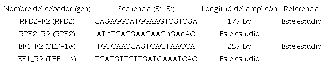 Identificación molecular de los aislamientos deFusarium. El micelio proveniente de 79 cultivos monospóricos se separó cuidadosamente del medio y se liofilizó durante 3 días para eliminar totalmente el agua del material. El ADN se extrajo a partir de 20 mg de micelio macerado según el método de extracción de ADN a gran escala de (Brandfass y Karlovsky 2008). La identificación molecular de los aislamientos se realizó mediante PCR en tiempo real y secuenciación con cebadores específicos diseñados para amplificar una región corta y variable de los genesTEF-1α(factor de elongación de la traducción 1-alfa) yRPB2(subunidad de la ARN polimerasa II) enFusarium(Tabla 1).