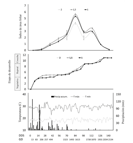 En cuanto a las condiciones atmosféricas, durante el ensayo, la temperatura máxima fue de aproximadamente 30 C, mientras que la mínima fue de 19 C. La temperatura máxima fue alcanzada generalmente a las 13:00 horas. La temperatura mínima se ubicó entre 4:00 y 5:00 horas. La precipitación durante setiembre y octubre fue de 270 y 234 mm, respectivamente. A partir de noviembre, se observó una disminución de la precipitación. La mayor parte de las lluvias se distribuyeron a lo largo de la etapa vegetativa y la disminución de estas, coincidieron con el inicio de la etapa reproductiva (Figura 1).