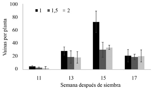 Componentes del rendimiento. Durante la semana 12 se observó y cuantificaron las primeras vainas formadas. En la semana 15, se produjo la mayor cantidad de vainas emitidas. Para cada distancia de siembra (1 m, 1,5 m y 2 m) se obtuvo un total de 125; 89 y 74 vainas por planta, respectivamente. La cantidad de vainas por planta fue mayor con la distancia de 1 m entre plantas en comparación con los otros distanciamientos; en la semana 15, esa diferencia fue estadísticamente significativa (p<0,05). Por otra parte, en la producción de vainas por planta para los distanciamientos de 1,5 m y 2,0 m, no se presentaron diferencias significativas (>0,05) (Figura 2).