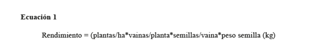 En cuanto al rendimiento, para cada una de las 3 densidades de siembra se calculó a través de la multiplicación de la cantidad de plantas por hectárea, vainas por planta, semillas por planta y el peso de la semilla (Ecuación 1).